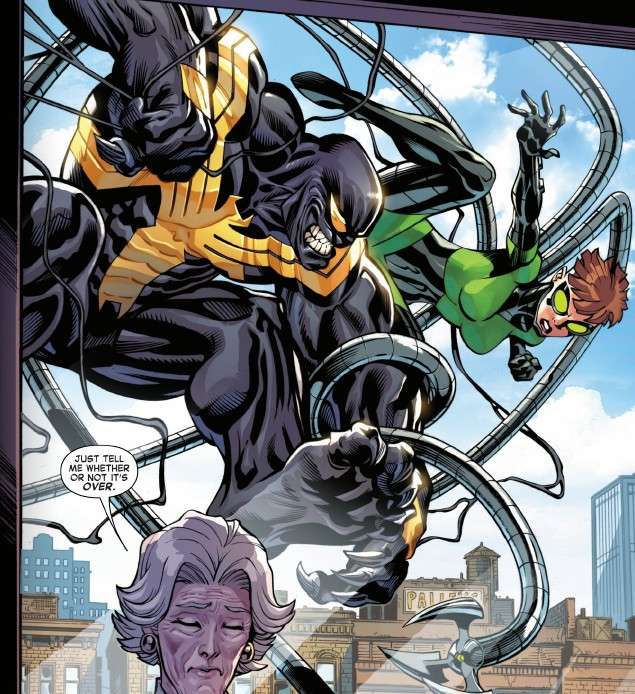 Peter is worried about Aunt May’s safety now that Carnage knows his secret identity, but he’s distracted by Venom fighting Lady Octopus outside.