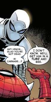 Anti-Venom helps Spidey up stand up, fulfilling his mandated appearance in this issue.