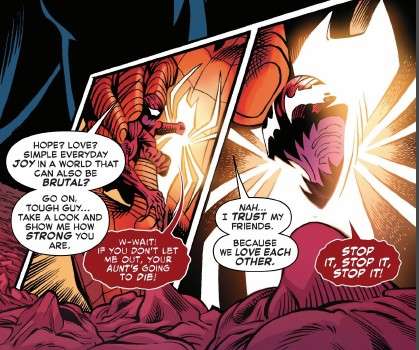 Inside Peter’s mind, he confronts the Carnage symbiote and proves that he is stronger than it, driving it out of himself.