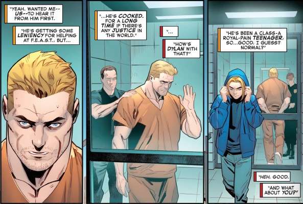 Eddie goes to jail … why? Is this because of things that he did in the Carnage series? I never read it so I don’t know what crimes Eddie committed there, or between the time he had was Venom and when he took on the Carnage symbiote. Yes, he bonded with the Carnage symbiote and killed some bad people, but there are dozens of people who have been taken over by symbiotes and weren’t responsible for their actions because the symbiote was in control. Isn’t he publicly known as Venom, a hero who worked for years with the Avengers and other heroes? This issue should explain exactly why he is going to jail. He tried to keep the Carnage symbiote bonded to himself to keep it from killing random people. If this is something from the Carnage series, or if it’s something I missed here, let me know.