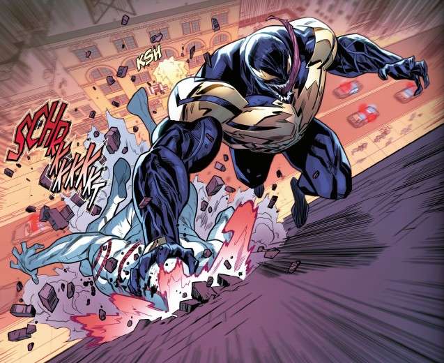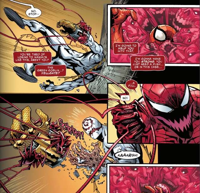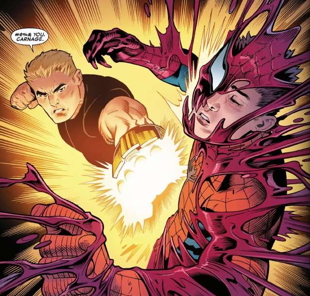 The Carnage symbiote has taken over as Spider-Carnage attacks Venom and is about to kill them, but he is stopped by Eddie Brock, wearing Shocker’s gauntlet.