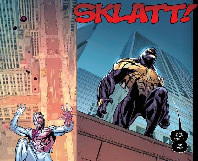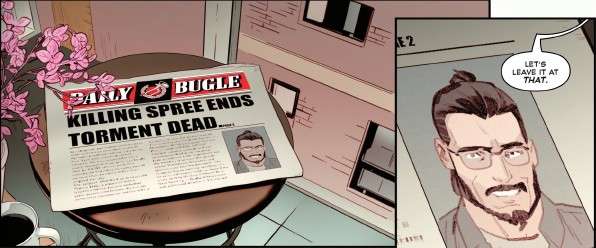 (4) Yes, it’s a comic book, and Torment could still be alive. But he’s clearly intended to be dead here. He falls off a building, there’s a literal SKLATT, the authorities are there to clean up the bodies, and the Bugle says Torment is dead.