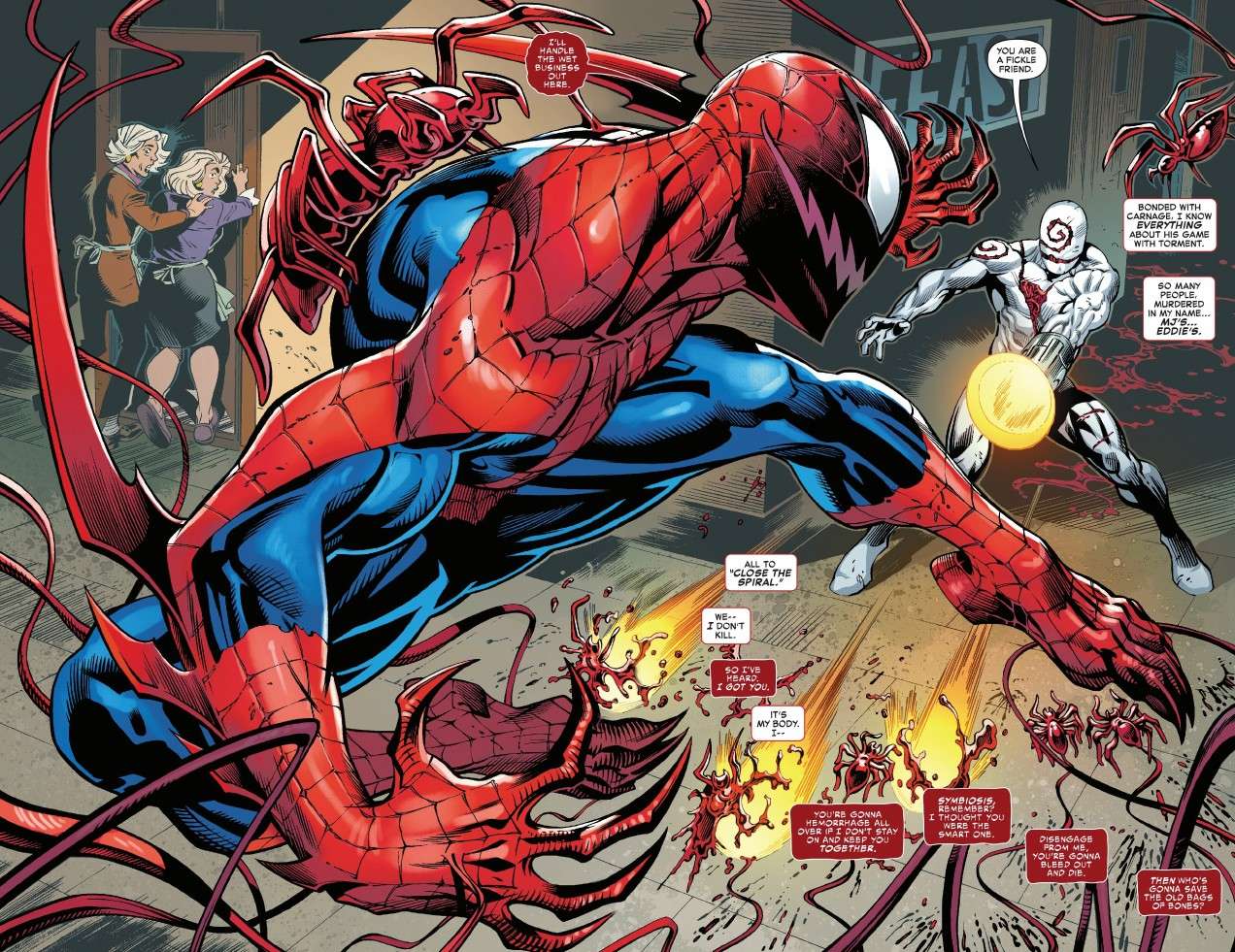 Torment/Carnage attack Aunt May and Aunt Anna at FEAST. May fights back with hot soup but is saved by Anti-Venom. T/C uses Shocker’s gauntlet on Anti-Venom, and they decide to separate – the Carnage symbiote will go after May and Anna, while Torment fights Anti-Venom. Eddie is in the hospital and sees on the news that symbiotes are attacking FEAST and leaves to go there. The Carnage symbiote kills random people, angering Torment, who turns his gauntlet on the symbiote. Spidey and Venom show up, but Torment knocks Venom out, and seriously wounds Spidey, who is saved by the Carnage symbiote, becoming Spider-Carnage.