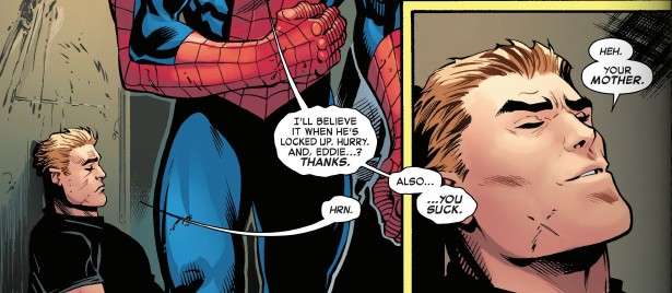 Spidey fights Torment/Carnage while Eddie (dying without the Carnage symbiote) worries about Dylan, who is in the sewers with Venom. Spidey realizes that Torment is “all method” and won’t let the Carnage symbiote indiscriminately kill people. Flash takes Aunt Anna to meet Aunt May at FEAST while Venom takes Eddie to the hospital. Spidey catches T/C about to kill a random guy whom T/C says is Peter’s first cousin. Spidey saves this mysterious family member as T/C arrives at FEAST.