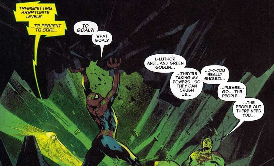The action also delivers. Spider-Man outsmarting Venom while Luthor and Goblin underestimate him is a satisfying reminder that Peter’s greatest weapon has never been brute force. Even in a crossover involving Superman-level stakes, Spider-Man wins space for himself through intelligence, agility, and nerve. The visual of Superman blasting back into the fight after the kryptonite levels drop is pure crowd-pleasing superhero comics, but it works because the comic earns that catharsis first. The heroes are not just trading poses; they are actively helping each other survive, physically and emotionally.